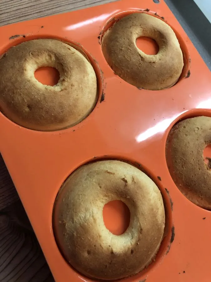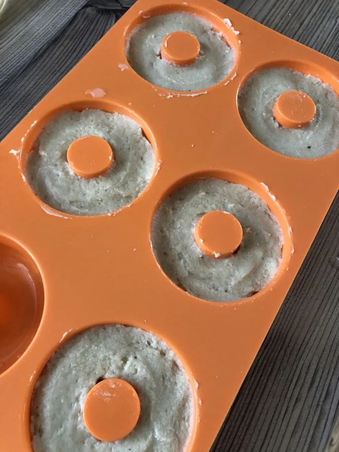 • Teig in einen Spritzbeutel mit großer Lochtülle füllen und in die Donuts Silikonform spritzen! Würde evtl. auch für 6 Stück reichen, ich habe ihn aber auf 5 Donuts verteilt, da ich Donuts gerne etwas höher mag!