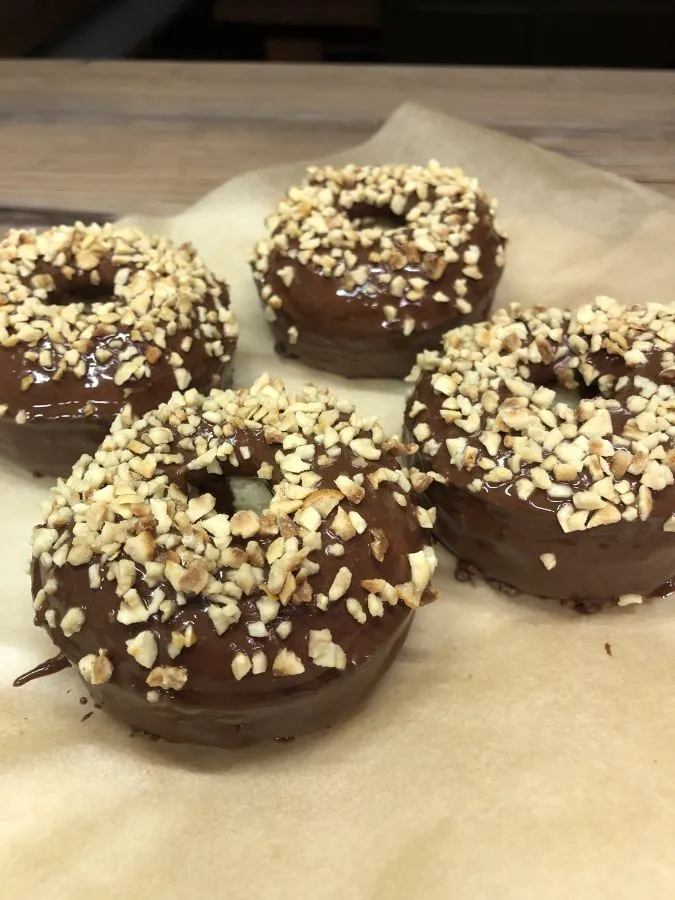 • Schokoladenzauber schmelzen (ich schmelze immer 75-100g) und die Donuts damit bepinseln oder Schokolade darüber gießen. Rest einfach so verzehren! Pro Donut sind 10g bei den Nährwerten inclusive.