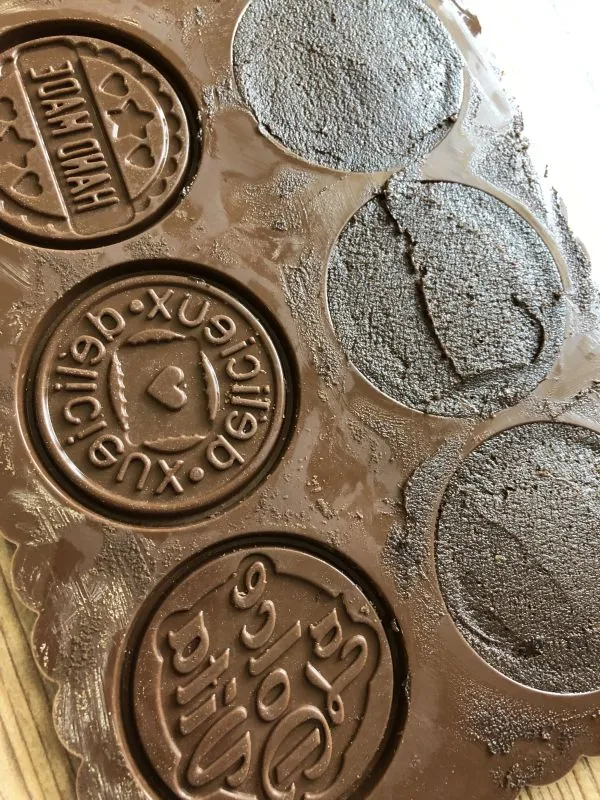 Ich habe für super dünne Kekse die Schokoladenform der Schoko und Keks Sets genommen! Man könnte sie dann auch noch mit Schokoladentäfelchen aus den gleichen Formen zusammensetzen! Sieht sicher super hübsch aus!