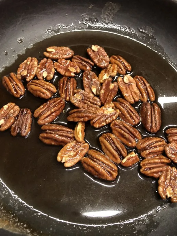 - Karamelltraum in einer Pfanne erhitzen und auflösen. Die Pekannüsse in die Pfanne geben und bei mittlerer Hitze ca. 1-2 Minuten unter Rühren karamellisieren.