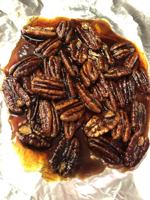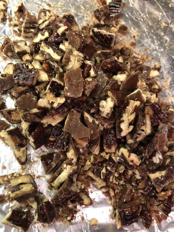 - Nun die karamellisieren Pekannüsse auf die Schokolade geben, etwas in die Schokolade drücken.