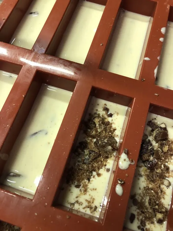 - In die Silikonriegelform geben (Link siehe oben bei den Zutaten). Ich habe die Schokolade in 8 Portionen aufgeteilt.