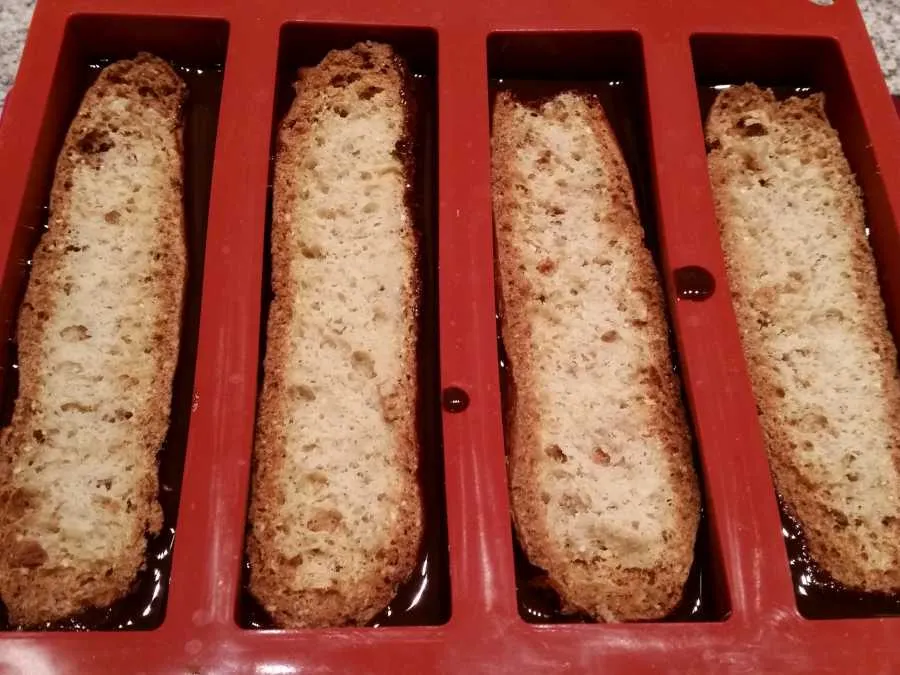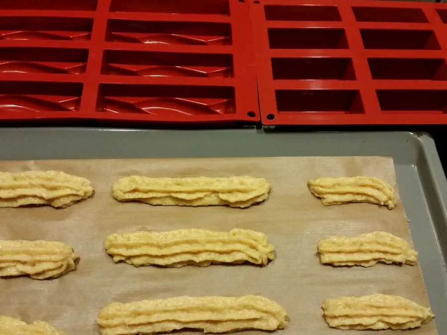 • Je dünner desto besser, umso knuspriger wird der Teig und umso besser kriegst du die Dinger in die Form. Ich habe mir die Form daneben gelegt, um in etwa die Abmessungen anzupassen. Bei 190 °C ca. 60 min bei Umluft oder 70 min bei Ober- und Unterhitze backen, anschließend auf einem Gitter auskühlen lassen. Bei mir durften sie schonmal kurz in der Form "Probeliegen". Wenn sie abgekühlt sind mit einem scharfen Messer in zwei Hälften schneiden. Bilder siehe weiter unten!