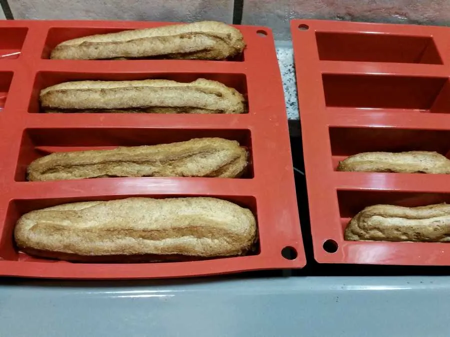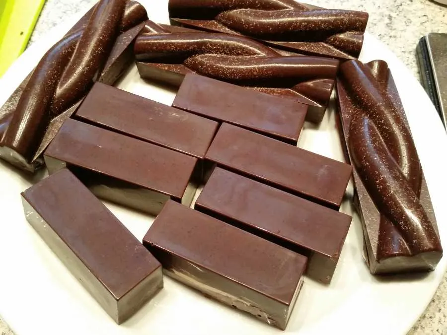 • Für die Zubereitung ohne Form ziehst du den Schritt mit der Füllung vor: Den Eclairboden mit Creme versehen, den Deckel aufsetzen und die Eclairs im Kühlschrank lagern bis die Creme fest ist. Anschließend mit Hilfe eines Zahnstochers im Schokoladenbad (Wichtig! Die Schokolade sollte nicht mehr als 30 - 32 °C haben damit die Creme in den Eclairs nicht schmilzt!) wenden und abtropfen bzw. erkalten lassen. Evtl. nach kurzem Erkalten nochmals wenden um eine dickere Schokoladenschicht zu erhalten. Bilder siehe weiter unten!