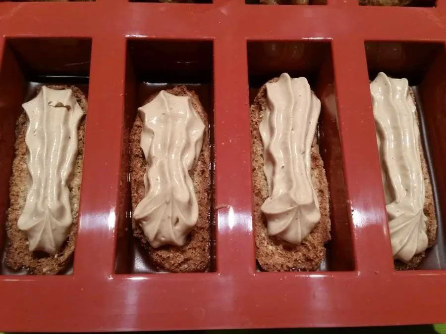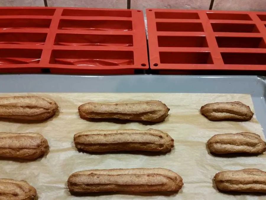 • Bei der Zubereitung mit einer Silikonform befüllt ihr die Formen zu ca. 1/3 mit Schokolade und legt die untere Hälfte der Eclairs darauf (bisschen eindrücken, aber nicht so tief, dass sie von der Schokolade bedeckt werden. Im Kühlschrank etwas fest werden lassen und die Haselnusscreme zubereiten. Bilder siehe weiter unten!