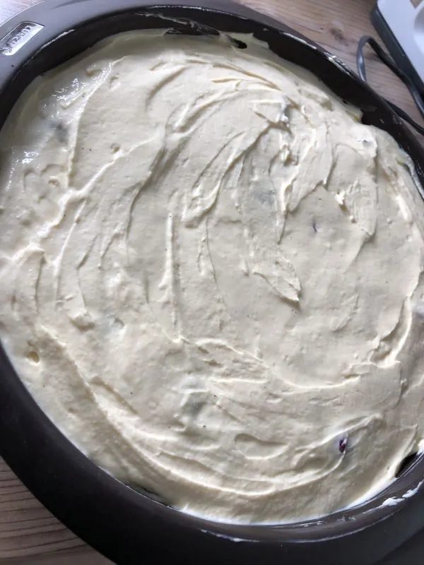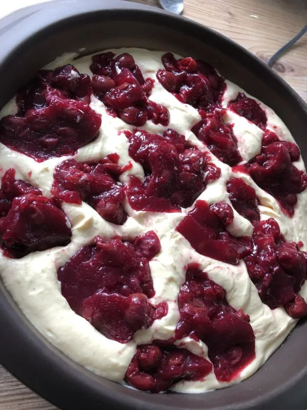 • Nun die Hälfte der Käsemasse auf den gebackenen Mürbteigboden geben. Kleckse der Kirschfülle darauf geben und alles wieder mit Käsemasse bedecken.