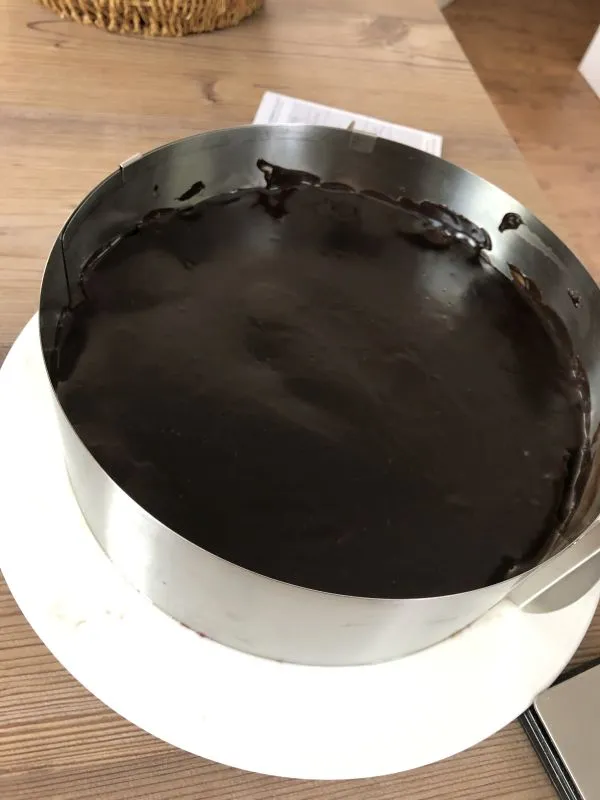 • Für den Schokoladenbezug die Sahne erhitzen, ganz kurz aufkochen lassen, vom Herd nehmen und den Schokoladenzauber einrühren! Auf den Kuchen geben! ACHTUNG - der Kuchen sollte sich in der Form befinden oder es sollte sich ein Backrahmen daran befinden. Schokolade läuft sonst in noch warmen Zustand runter!