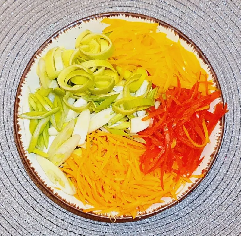 - Für die Spätzlepfanne Gemüse schneiden, Lauch und Frühlingszwiebel in Röllchen, Karotte und Paprika in Streifen.
