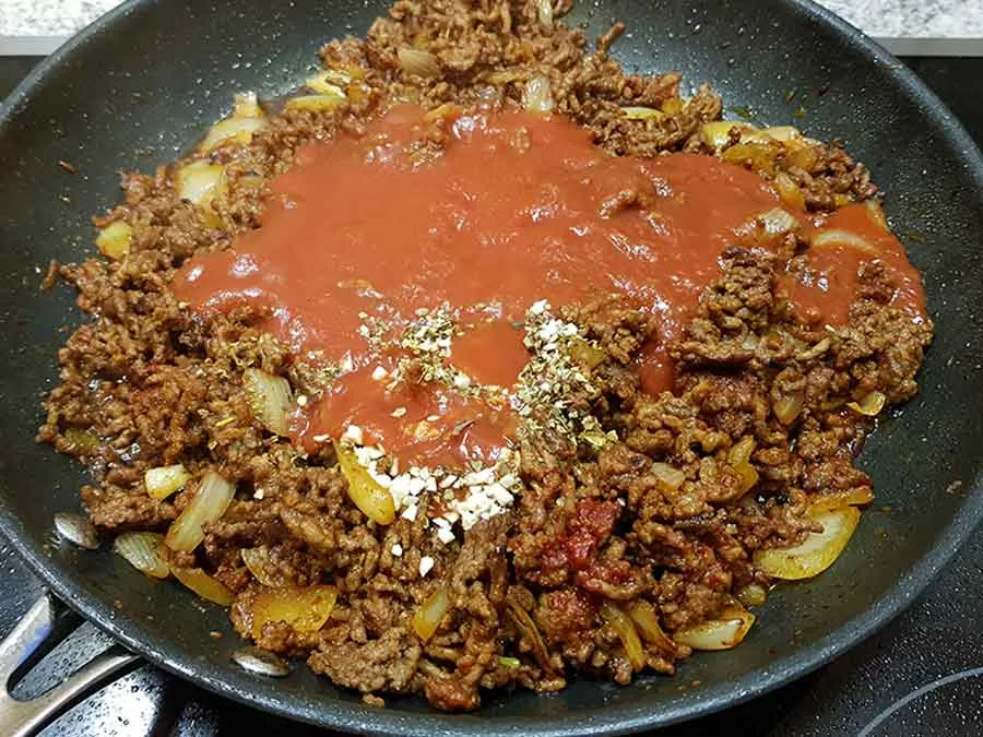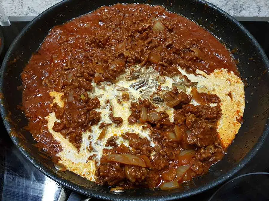 • Wenn die Zwiebeln glasig und das Hackfleisch vollständig durchgebraten ist: mit Rotwein ablöschen und den Senf unterrühren. Ein paar Minuten schmoren lassen, das Tomatenmark zugeben und gut unterrühren.