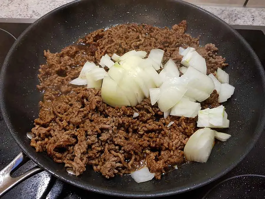 • Die Zwiebeln kleinschneiden und zugeben, sobald vom Hackfleisch nur noch wenige rohe Stellen zu sehen sind. Den Knoblauch feinhacken und ebenfalls kurz mitbraten.