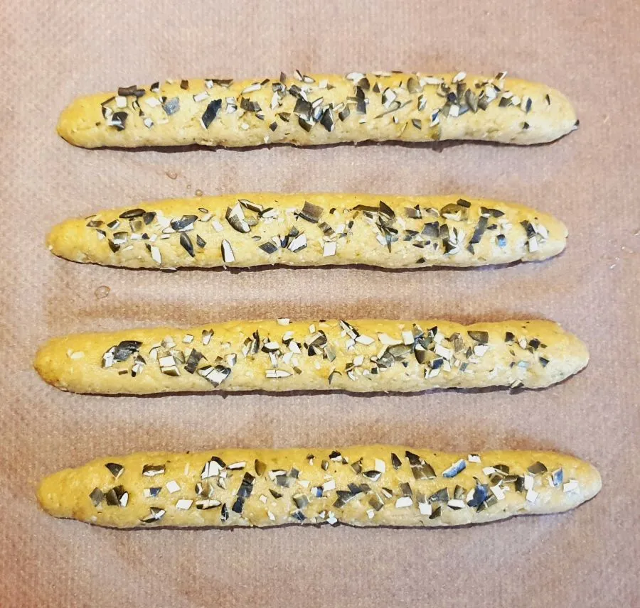 - Aus dem Teig 4 Teigstangen formen, mit feuchten Fingern glatt streichen und mit gehackten Kürbiskernen bestreuen. Bei 170 Grad Umluft 30 Minuten backen. Auf einem Gitter auskühlen lassen.