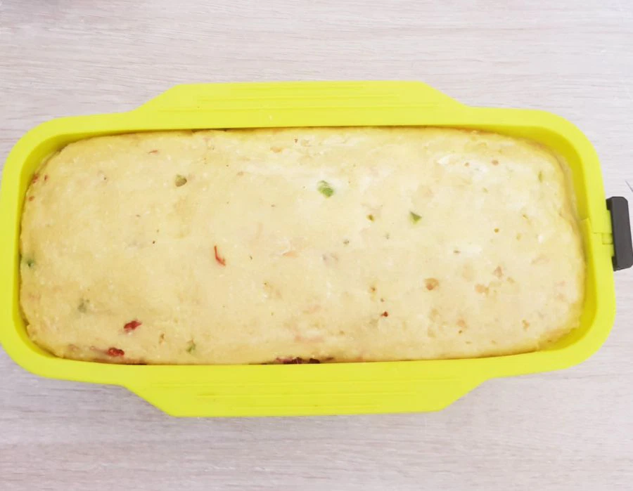 - Spargel, Tomaten und Lachs gut unterheben und den Schafkäse zum Schluss, aber ganz locker! Er soll noch gut sichtbar sein. Eine längliche Backform vorbereiten. Entweder Silikon oder eine aus Metall, diese aber mit Backpapier auslegen.