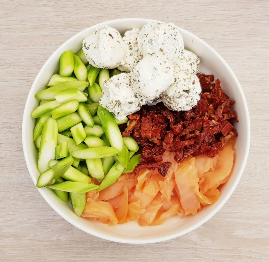 - Lachs klein schneiden und den Schafkäse abseihen, damit die Flüssigkeit abtropft.