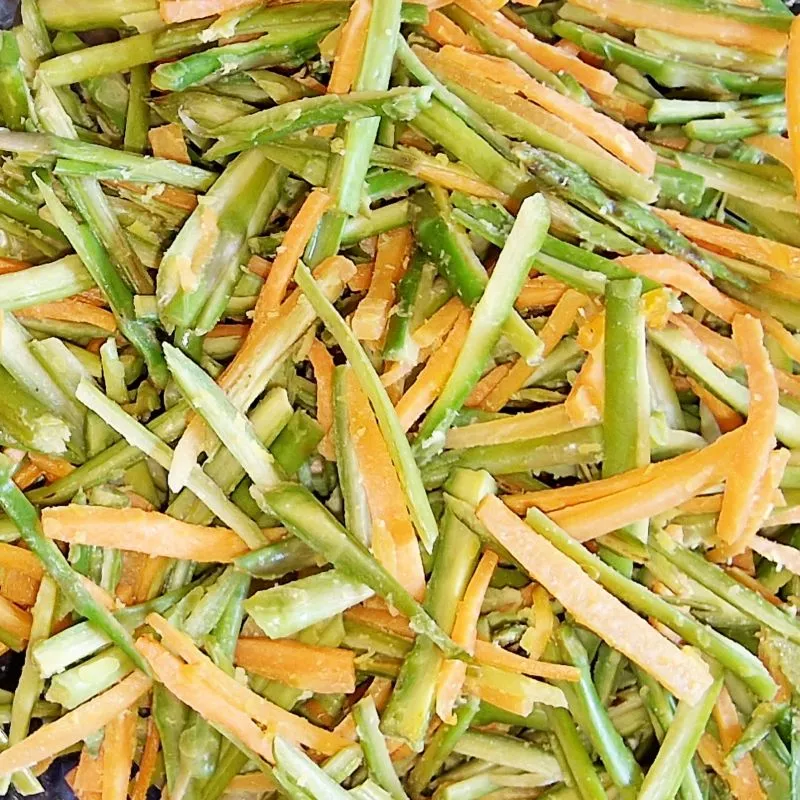 - Für die Spargelrolle den Spargel und die Karotte in Stifte schneiden, in einer Pfanne Butterschmalz erhitzen und Spargel und Karottenstifte kurz anbraten. Zum Abkühlen zur Seite stellen.