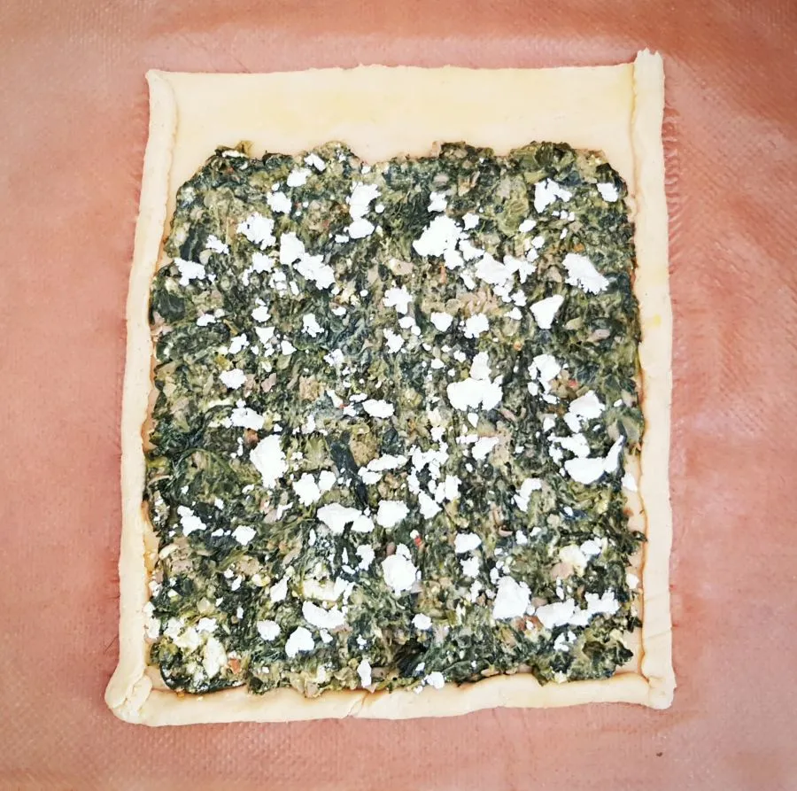 - Blattspinat dämpfen, in der Zwischenzeit Schinken ganz klein würfeln, Paprika und Knoblauch auch klein würfeln und mit dem Schinken in Ghee anbraten. Den gedämpften Spinat in die Pfanne dazu geben und mit 50 ml Wasser aufgießen, würzen und so lange köcheln bis das Wasser verkocht ist. Mit Creme Fraiche verfeinern und die Zitrusfaser unter die Masse rühren. 2/3 vom Feta in die Spinatmasse bröseln und miteinander vermischen. In eine Schüssel zum Abkühlen füllen.