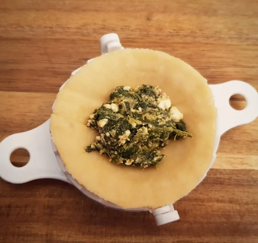 • Je 1 Kreis in den Teigtaschenformer legen, je 10g Spinatfülle in die Mitte legen und eine Tasche formen. Beim zusammenpressen den Überschuss mit einer Messerspitze abtrennen und mit einem feuchten Finger über den Rand streichen. So werden die Taschen schön gleichmäßig.