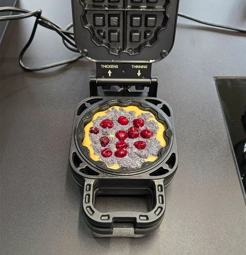 - Ca. 90 g Waffelteig in die Mitte der Backform geben - wiegt das unbedingt ab, damit der Teig für beide Waffeln reicht. Anschließend die Füllung von der Mitte aus vorsichtig auf den Waffelteig geben. Je nach Füllung klappt das sehr gut mit 2 Teelöffeln. Die Füllung darf auch ein bisschen in den Teig reingedrückt werden, sie sollte nur nicht so tief "absaufen", dass sie am Boden der Form ankommt. Kirschen auf der Füllung verteilen. Zum Schluss die Füllung incl. Kirschen mit weiteren 90 g Waffelteig bedecken.