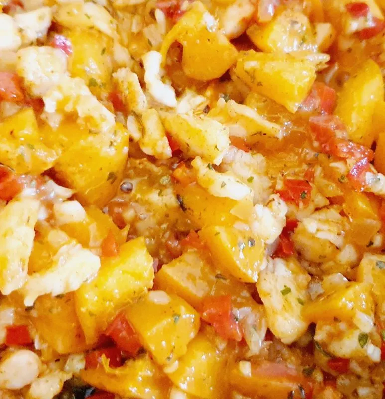 - Etwas abkühlen lassen und die Shrimps klein schneiden. Pfanne wieder erhitzen, Karamelltraum und Gewürze hinzufügen. Auf hoher Flamme kurz schmoren lassen, Marillen gewürfelt hinzufügen und mit Essig ablöschen. Zur Seite stellen und etwas abkühlen lassen.