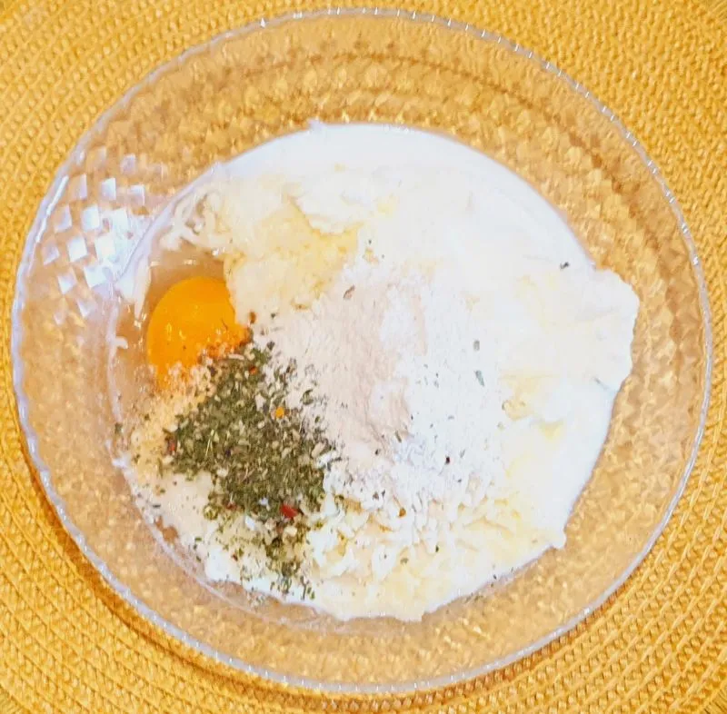 - Frischkäse, Ei, Milch, Gewürz, Zitrusfaser und Käse miteinander vermengen.