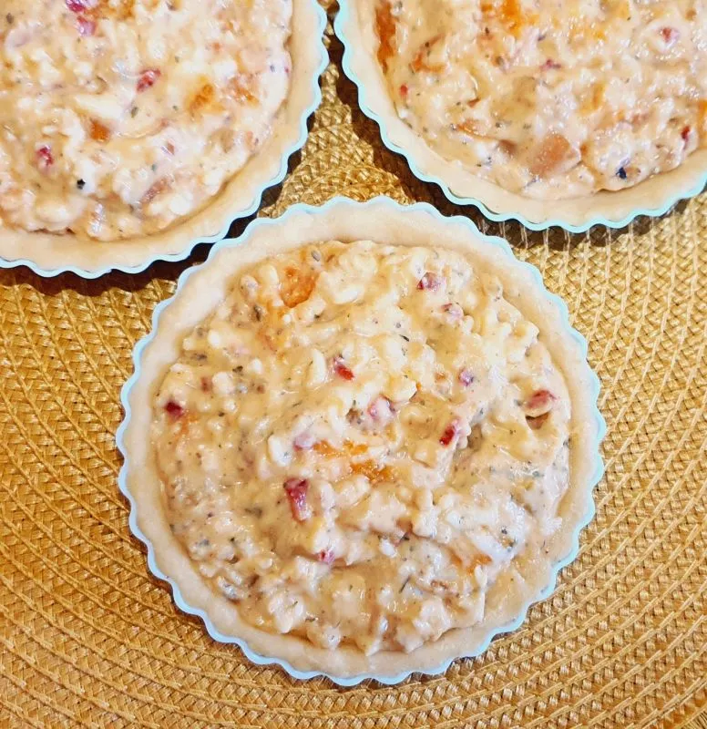 - Die Fülle auf die 6 Tortelettförmchen verteilen.