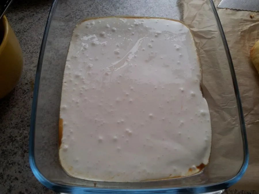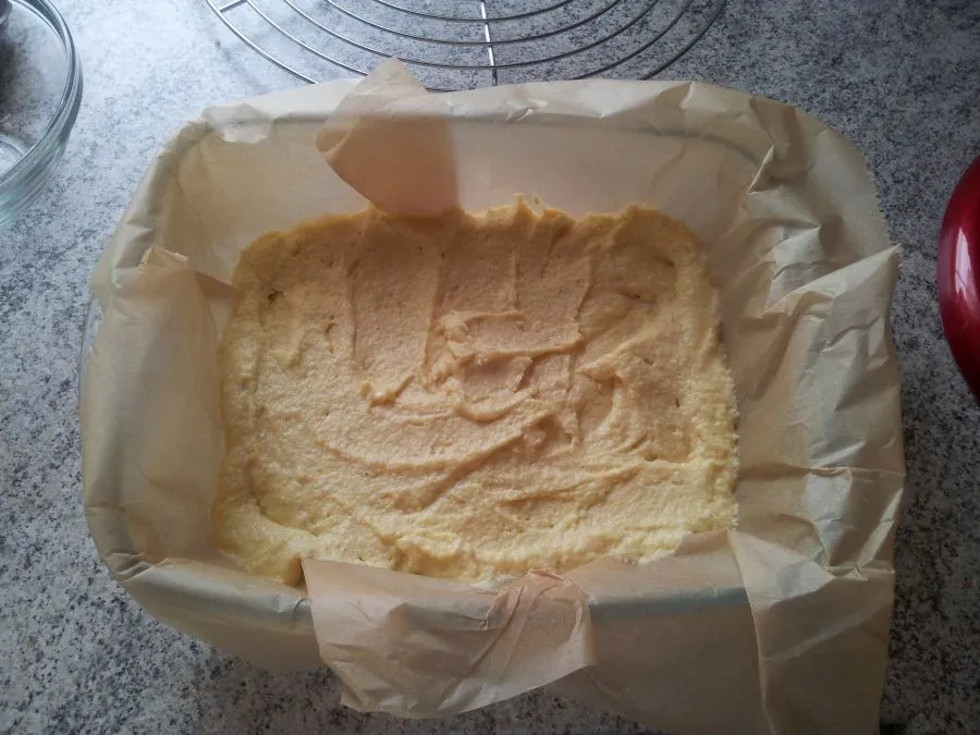 Die Auflaufform mit Backpapier auslegen und den Teig einfüllen.