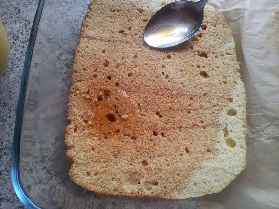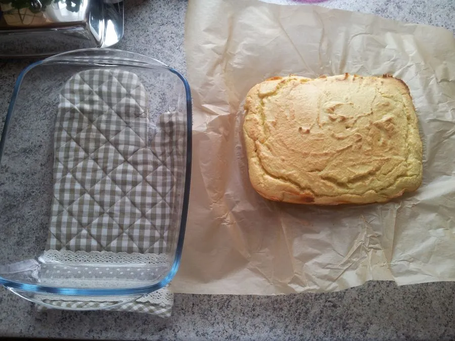 Den Biskuitboden aus der Form stürzen und auskühlen lassen. Mit einem scharfen Messer in 2 Böden schneiden und einen der Böden in die Auflaufform legen.