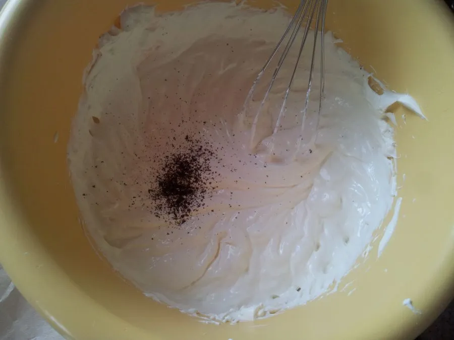 Mit der anderen Hälfte der Espresso-Amaretto-Mischung den zweiten Boden durchtränken und anschließend mit der restlichen Mascarpone-Masse bestreichen.