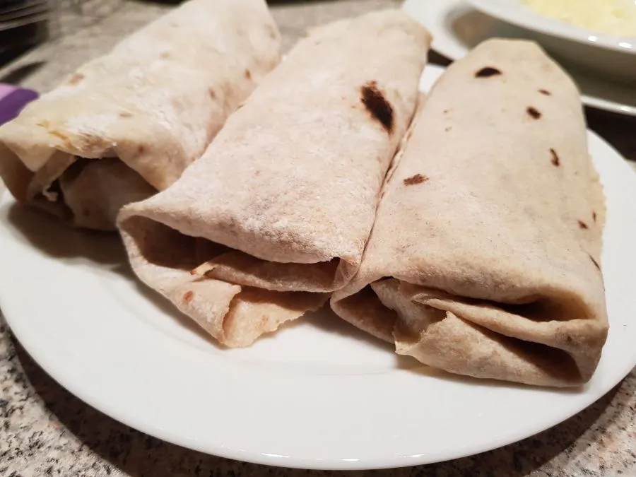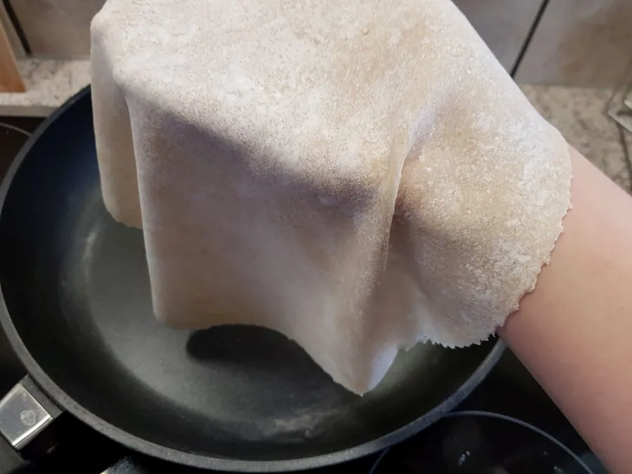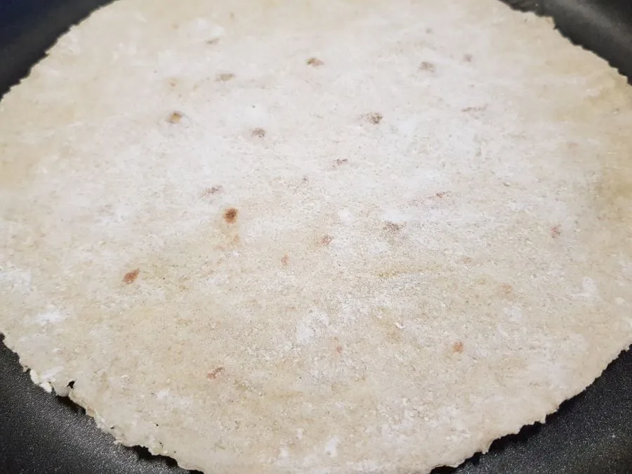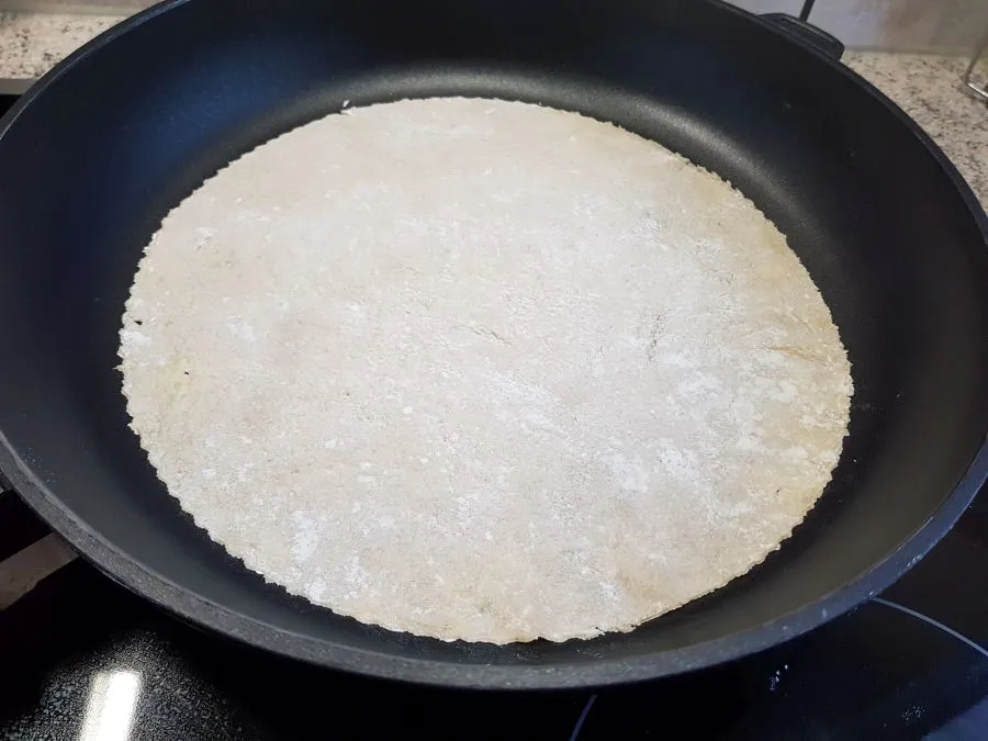 - Eine ausreichend große Pfanne erhitzen (ohne Fett!) und den Tortilla auf höchster Stufe ca. 1 min von jeder Seite backen. Tipp: sollte der Tortilla nach dem ersten Wenden eine Blase bilden, am besten sofort nochmal wenden - die Stelle an der die Blase entsteht wird gerne sofort dunkel. Anschließend nochmal wenden bis er von beiden Seiten durchgebacken ist. NICHT zu lange backen, da der Teig sonst zu stark austrocknet und beim Aufrollen hinterher bricht.