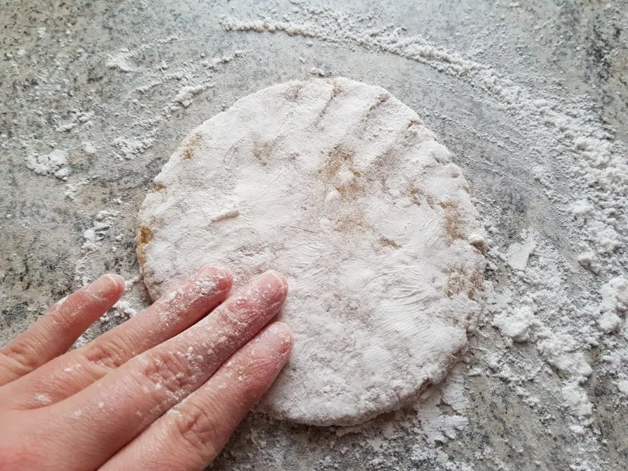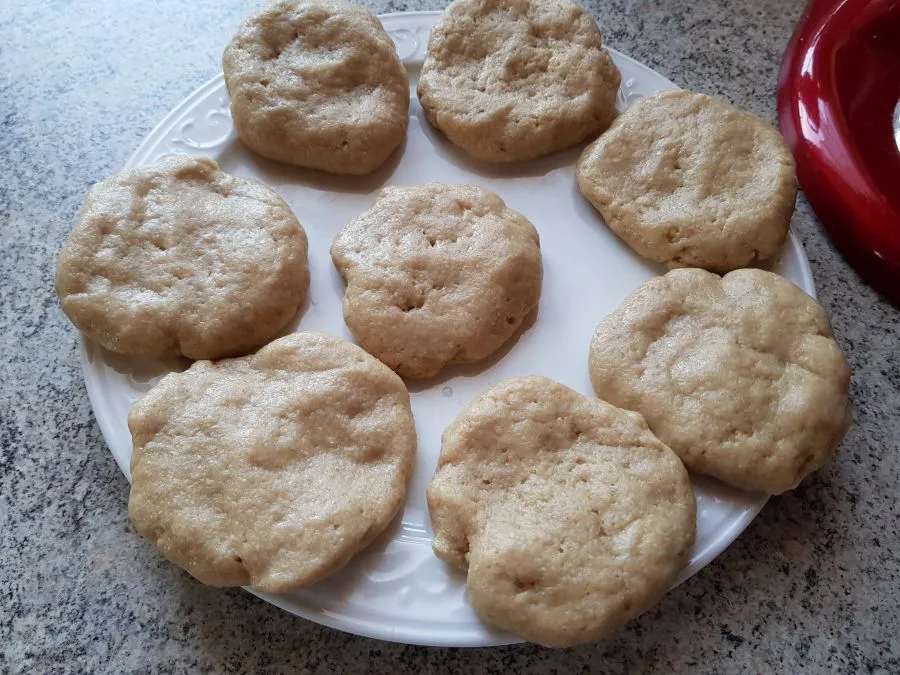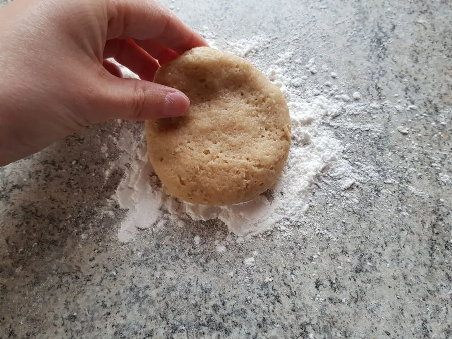 - Den Teig mit feuchten Händen zu 8 gleichgroßen Kugeln formen und jede Kugel zu einem Fladen von ca. 6 cm Durchmesser formen. Anschließend Hände waschen und gut abtrocknen. Jetzt kommt die Bambusfaser dran!