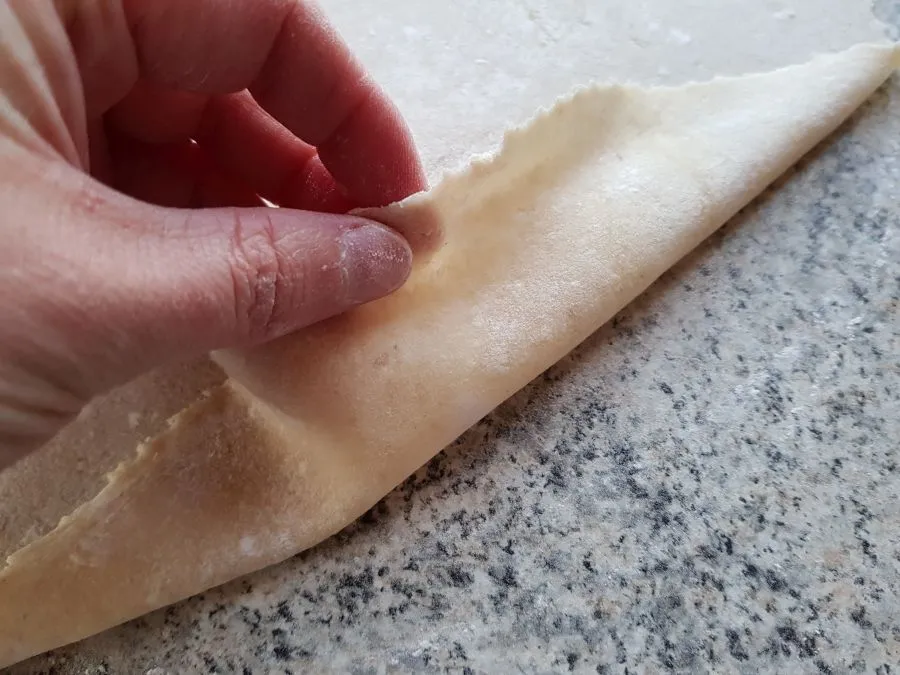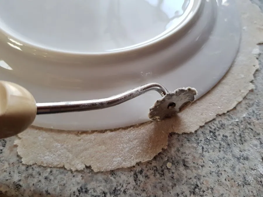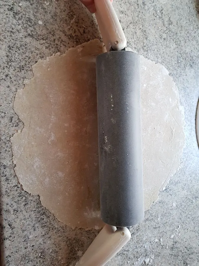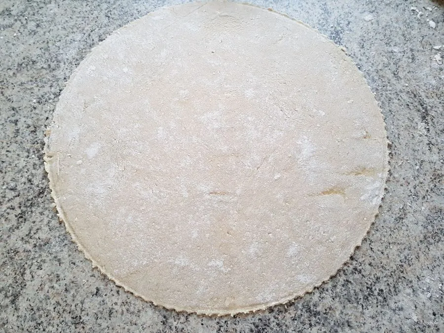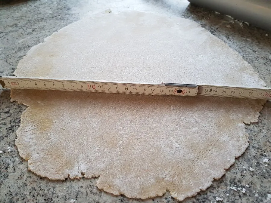 - Je nach gewünschter Dicke ausrollen (maximal 28 - 30 cm Durchmesser) und eventuell mit einem Teigschneider kreisrund ausschneiden (wenn es besonders hübsch werden soll). Tipp: Je dünner der Tortilla wird, umso besser lässt er sich rollen, umso leichter reißt aber auch der Teig beim Ausrollen. Die 28 - 30 cm Durchmesser ist man in einem optimalen Bereich. Für kleinere Tortilla einfach weniger Teig verwenden.