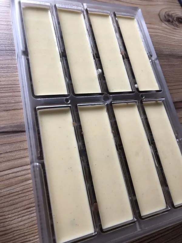 - Nun komplett alles ca. 2h durchkühlen lassen. Danach die Schokolade aus der Form nehmen. Die Riegel fallen normal beim Stürzen von alleine raus.