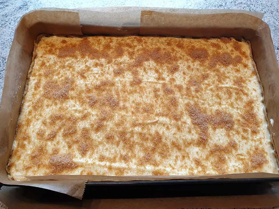 - Die Käsemasse auf der Apfelmasse verstreichen und mit Karamelltraum bestreuen.