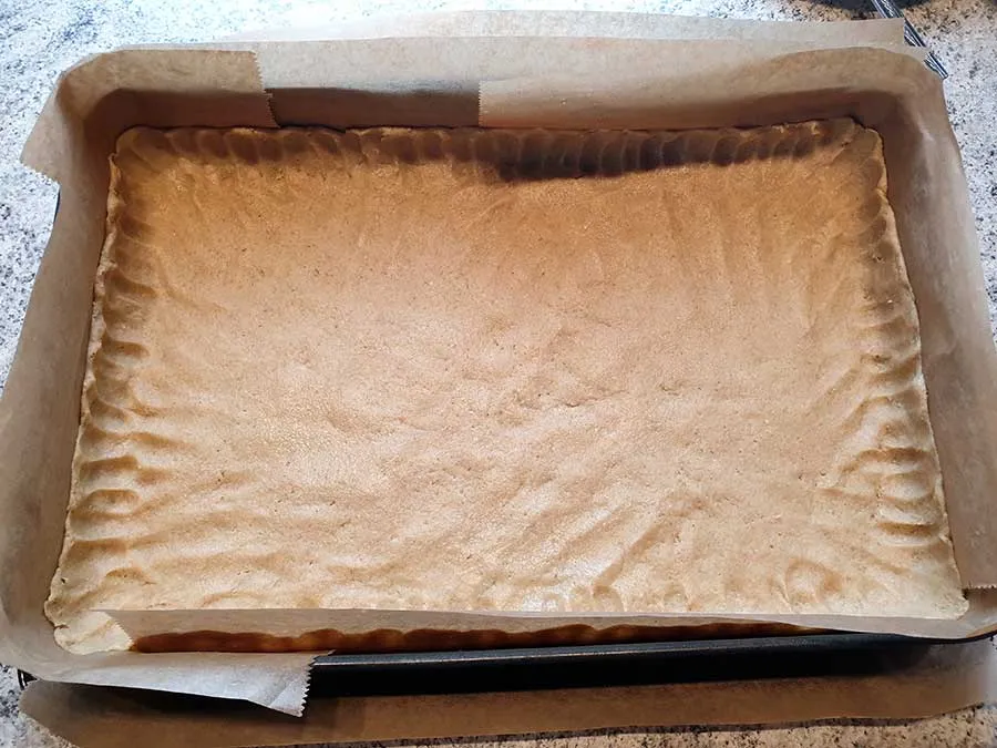 - Mit feuchten Händen auf dem Boden der Backform verteilen und am Rand ca. 2 cm hochziehen.
