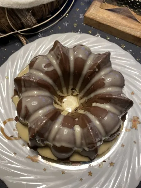 - Den abgekühlten Guglhupf wieder in die Form geben und etwas rein drücken bis die Schokolade oben an den Rändern austritt.