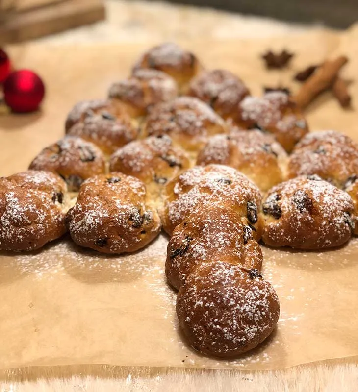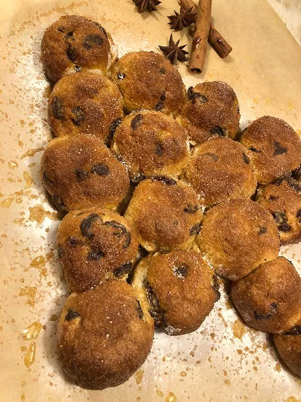 - Aus den Teig 17 Stück Bällchen formen. Die Bällchen auf einem mit Backpapier belegten Blech als Baum anordnen. Zwischen den Bällchen unbedingt 1 cm Abstand lassen - wächst beim Backen zusammen. Leicht mit Bambusfaser besieben für die Schneeoptik.