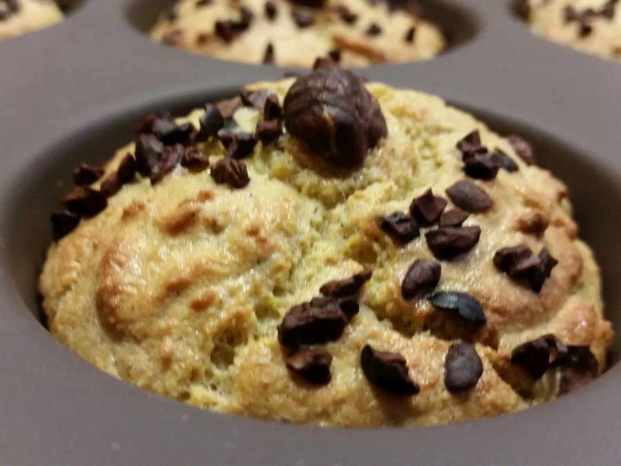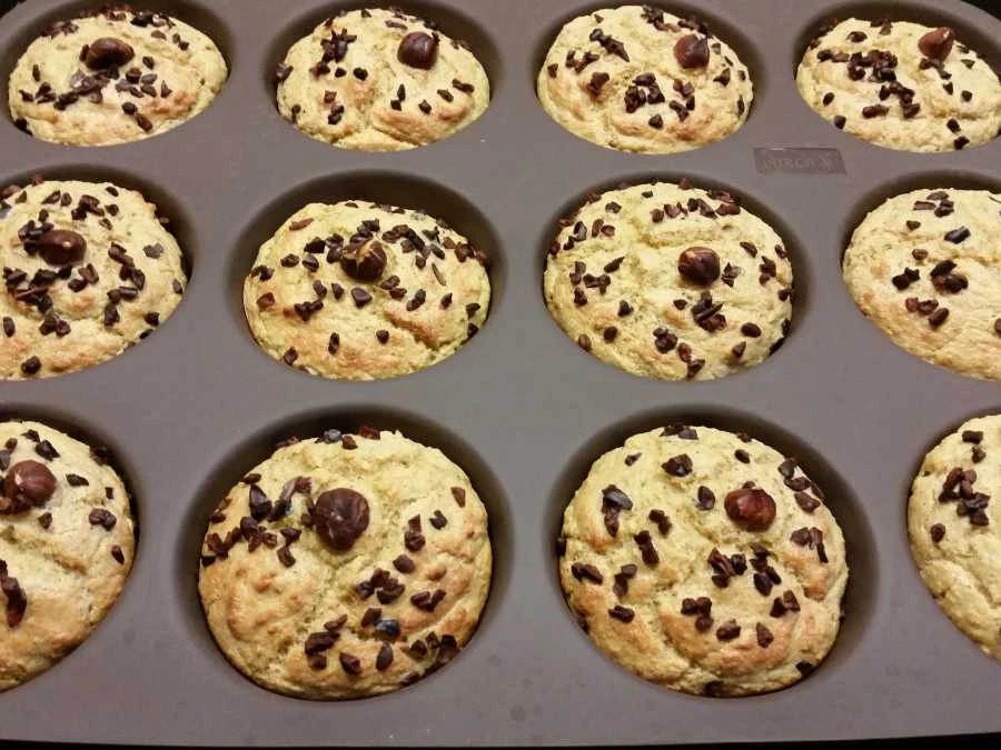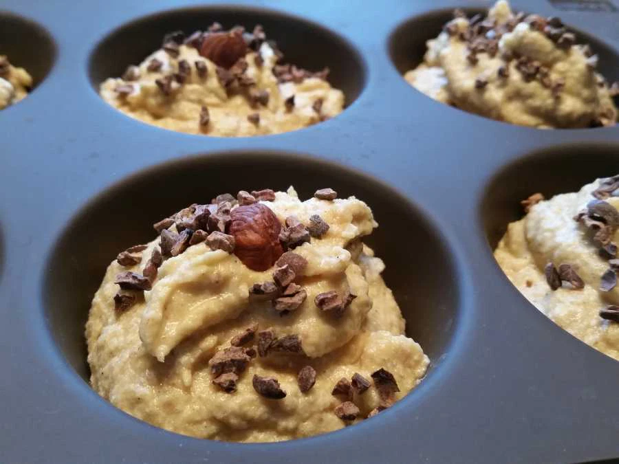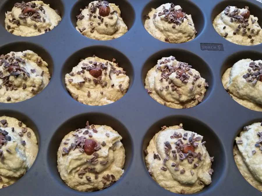 - Die Kakaobutter mit der Butter zusammen schmelzen und unter Rühren zum Teig geben. In eine Muffinform füllen, mit Haselnüssen und Kakaobohnensplittern dekorieren und bei 175 °C im vorgeheizten Backofen 15 – 20 Minuten bei Umluft oder 20 – 25 Minuten bei Ober- und Unterhitze backen.