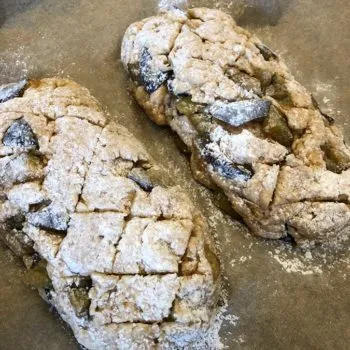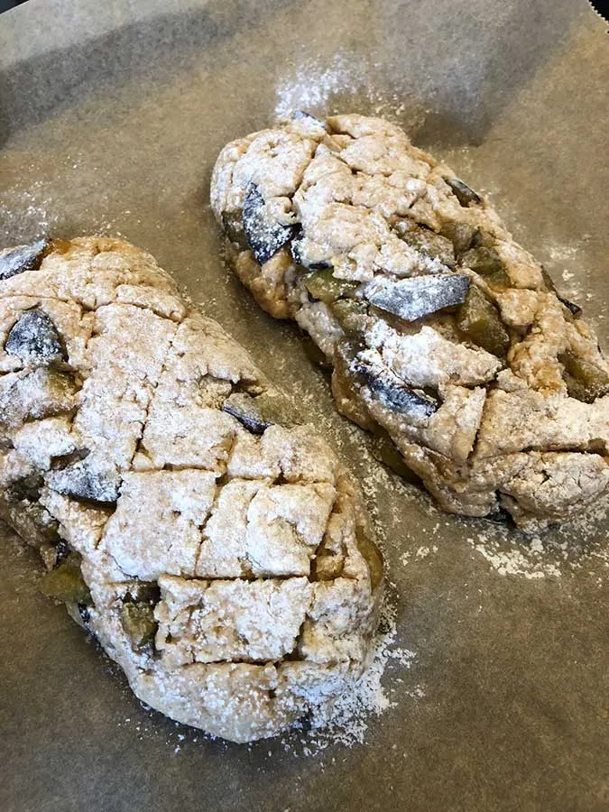 - Leicht mit Bambusfaser bemehlen - gibt schöne Optik - und mit einem scharfen Messer leichtes Rautenmuster einschneiden. Man kann die Stangen natürlich auch ohne Bambusfaseroptik und Muster backen.