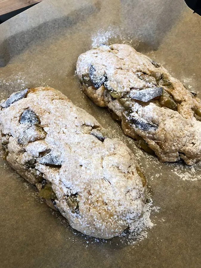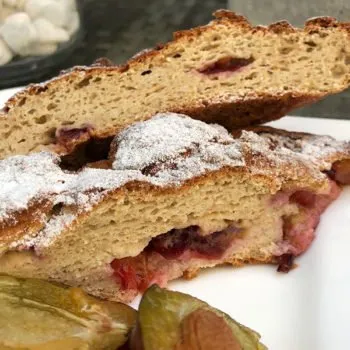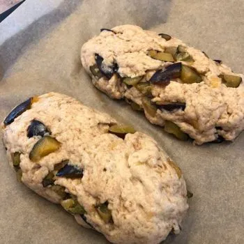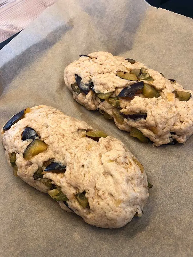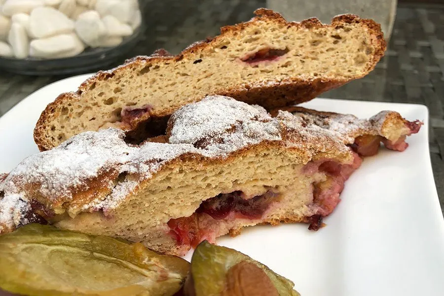 - Die 200 g Düsseldorfer Stutenbrot und den Zitronenabrieb zur Hefelösung geben und so lange rühren, bis ein gleichmäßiger Teig entstanden ist. Die marinierten Zwetschgen unterziehen.