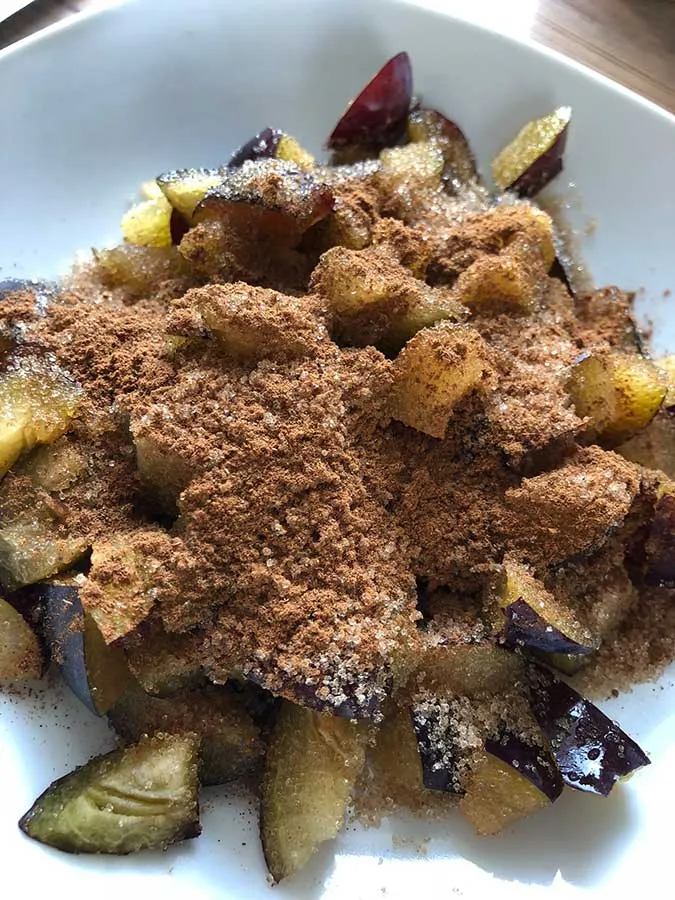 - Die Zwetschgen waschen, entkernen und in kleine Stücke schneiden. In einer Schüssel mit Zimt und Karamelltraum gut vermengen.