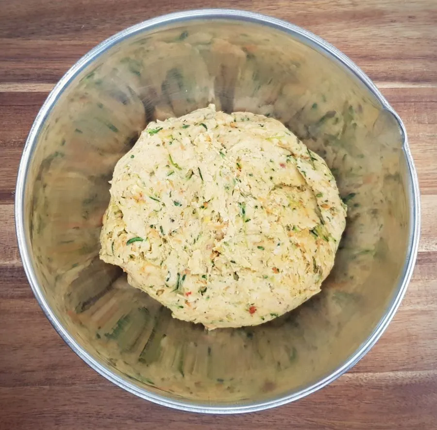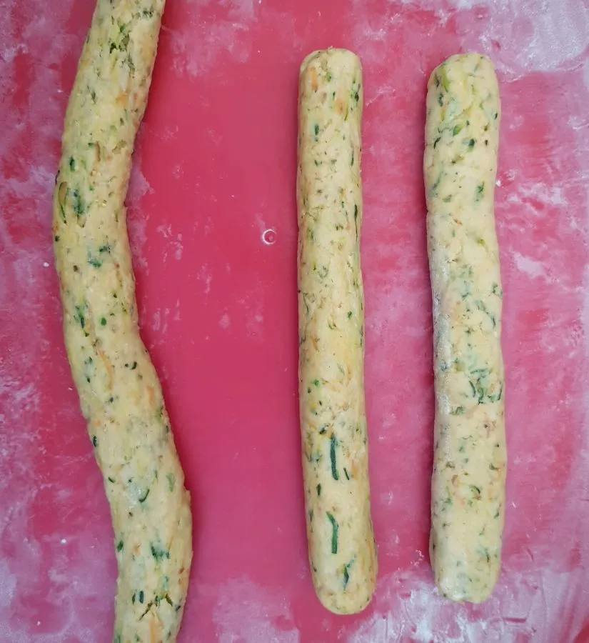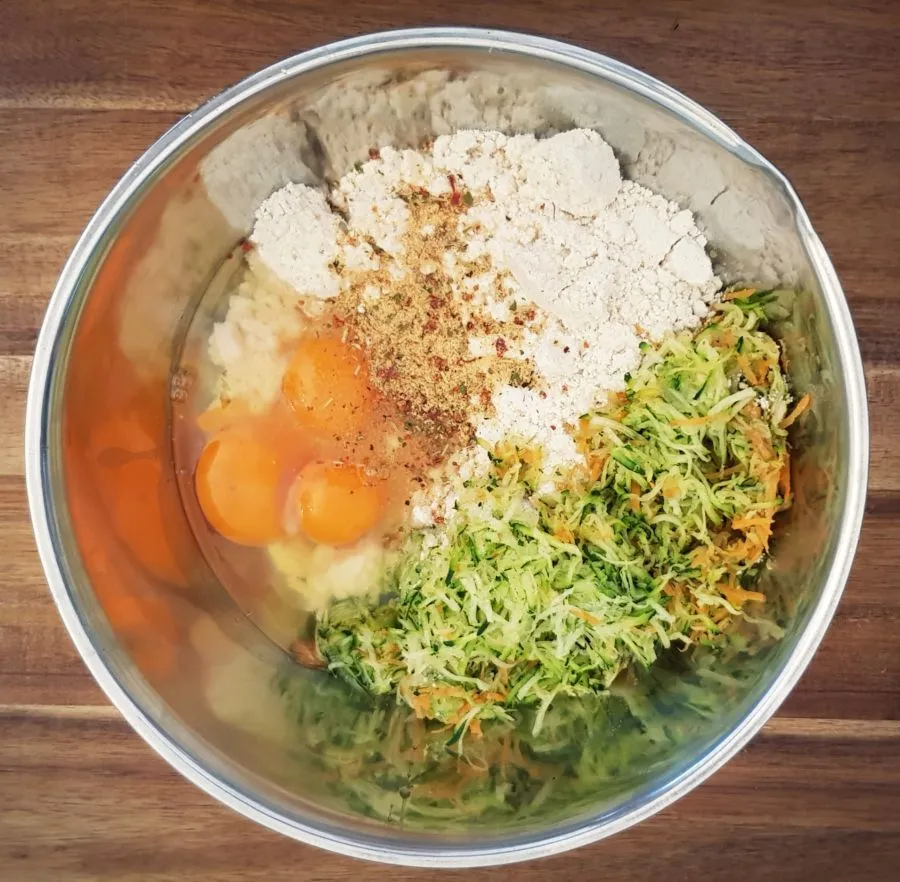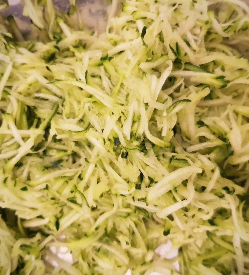 • Zucchini gut waschen und beide Enden wegschneiden, mit einer Küchenreibe die Zucchini ganz fein reiben. Karotte auch waschen und fein reiben. Etwas salzen und Wasser ziehen lassen. (Das Salz habe ich nicht in der Rezeptangabe berücksichtigt). In ein Küchentuch geben und die Flüssigkeit gut auswringen.