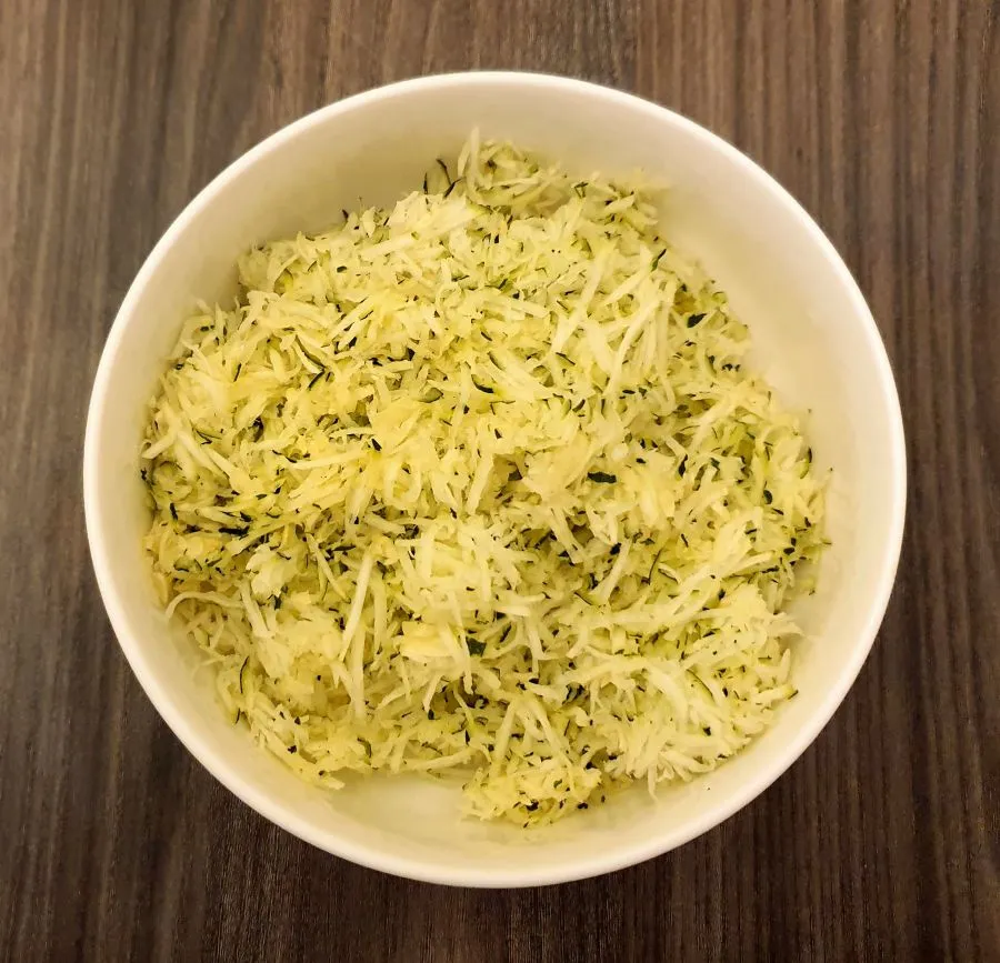 - Zu allererst von der Zucchini einiges an Schale schälen, etwas Grün kann bleiben, dann fein reiben, zur Seite stellen und Wasser ziehen lassen.