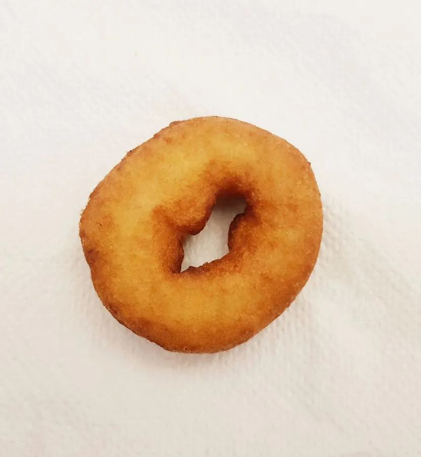 - Die Zwiebelringe müssen(!) gefroren in Zitrusfaser gewendet werden, und dann im Bierteig. Dafür benutze ich eine Gabel. Nach dem Tauchen im Bierteig sofort ins heiße Öl legen und frittieren. Ich mach das immer in 3er Schritten, hol 3 Ringe aus dem Gefrierschrank und wende sie zügig, ziehs durch den Backteig und frittiere sie raus. Nach dem Frittieren auf der Küchenrolle Öl abtropfen lassen.
