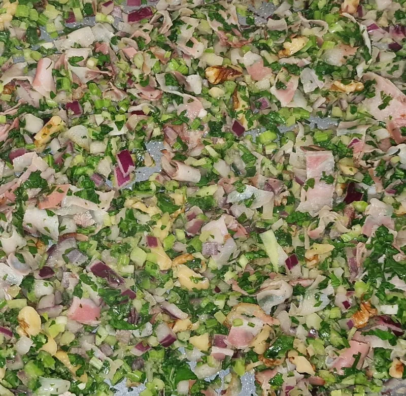 - Zwiebel, Petersilie und 1 Handvoll Kohl klein schneiden, den Speck in größere Stücke schneiden und die Walnüsse hacken. In einer Pfanne Butterschmalz schmelzen lassen, Zwiebel etwas anrösten, Speck, Petersilie, den kleingeschnittenen Kohl, die Hälfte der Gewürze und die Walnüsse hinzufügen und mit anbraten. Den blanchierten Kohl ausdrücken und zur Zwiebel Mischung hinzufügen und kurz mit anbraten. Etwas zur Seite stellen zum abkühlen.