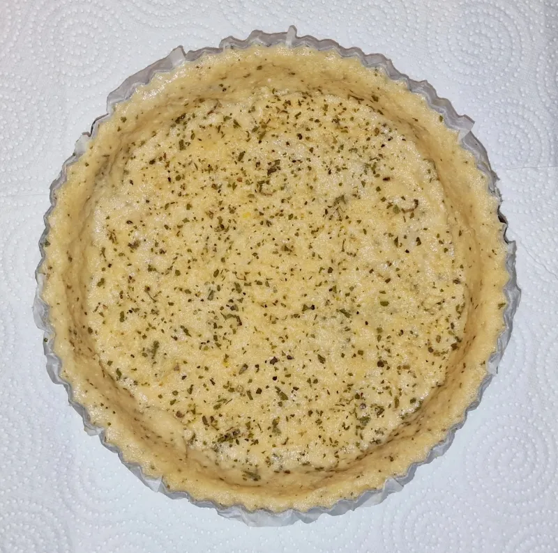 - In der Zwischenzeit den Teig zubereiten, Die Walnüsse klein hacken und mit den trockenen Zutaten vermengen. Eier mit Sauerrahm und Wasser versprudeln, die trockenen Zutaten hinzufügen und einen Teig zubereiten. Mit Hilfe von Bambusfaser auf einem rundzugeschnittenem Backpapier ausrollen und die Quicheform auslegen. Funktioniert aber auch gut mit feuchten Fingern. Backofen auf 160 Grad Umluft vorheizen, und für 10 Minuten vorbacken.