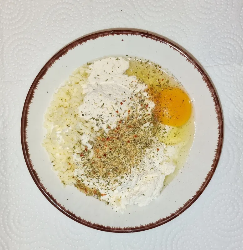 - Nun die Fülle fertig stellen. Eier, Sauerrahm, Ricotta und die Hälfte der Gewürze verquirlen, bis auf einen Esslöffel den Bergkäse hinzufügen (Rest zur Seite legen) und gut durchrühren. Von der Kohlmischung 4 - 5 EL zur Seite legen und den Rest mit der Ricotta Eimischung vermengen. Abschmecken ob gewürzt so passt. In die vorgebackene Teigmulde füllen und glattstreichen.